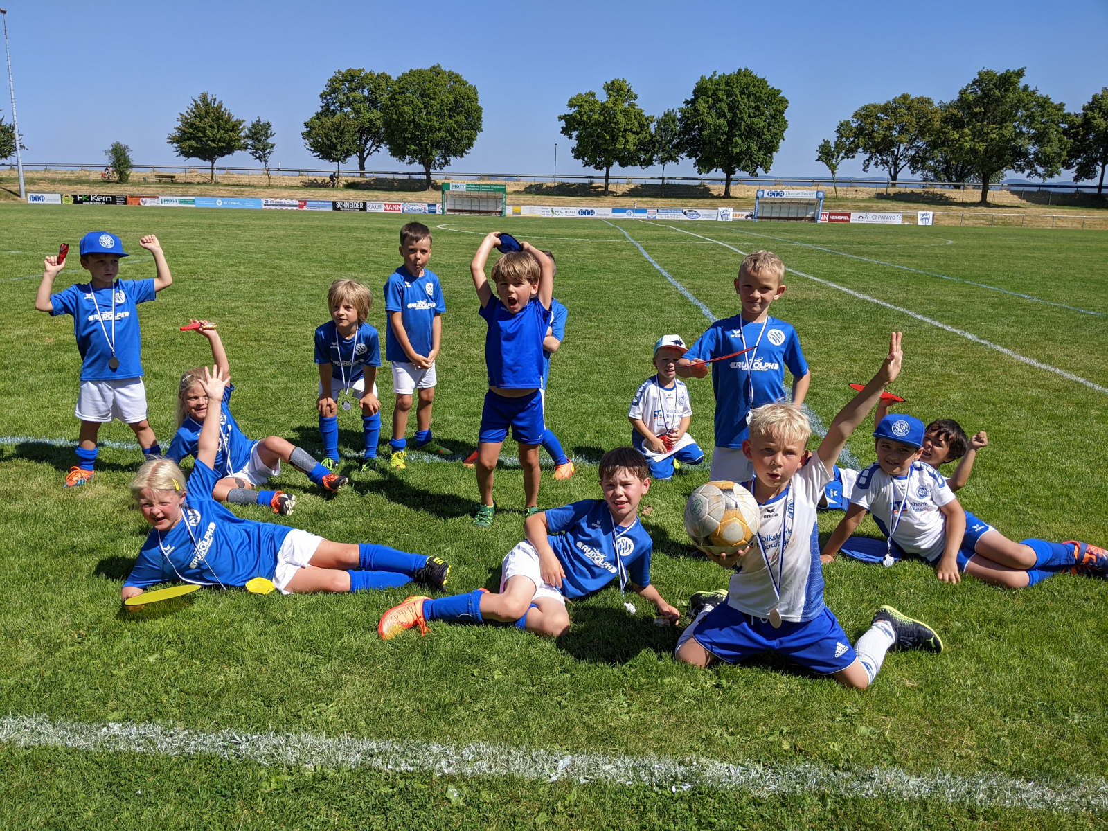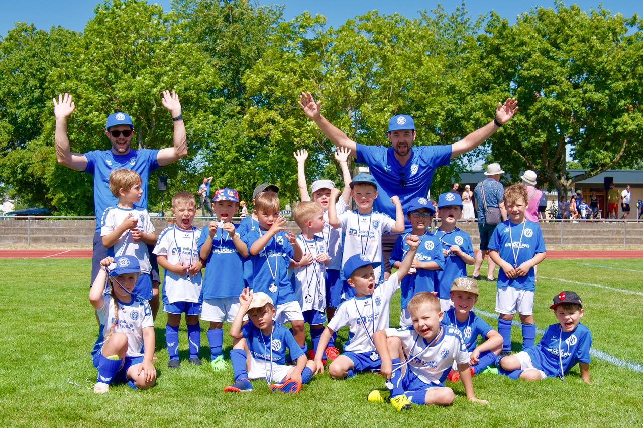 Bei den anschließenden Turnieren der jeweils älteren Jahrgängen fanden sich ebenfalls wieder zwei bzw. drei Mannschaften in blau-weiß auf dem (Kunst-)Rasen. Unsere 2014er-Mannschaften konnten in starken Gruppen jeweils gut mithalten und auch einen Sieg erringen. Am wichtigste war auch hier, dass die Kinder Spaß am Fußball hatten und wichtige Spielpraxis und Erfahrung sammeln konnten. Auch beim 2016er-Jahrgang bekamen alle Kinder jede Menge Spielzeit und waren mit Feuereifer bei der Sache. Am Ende gab es für alle TeilnehmerInnen die wohlverdiente Medaille.