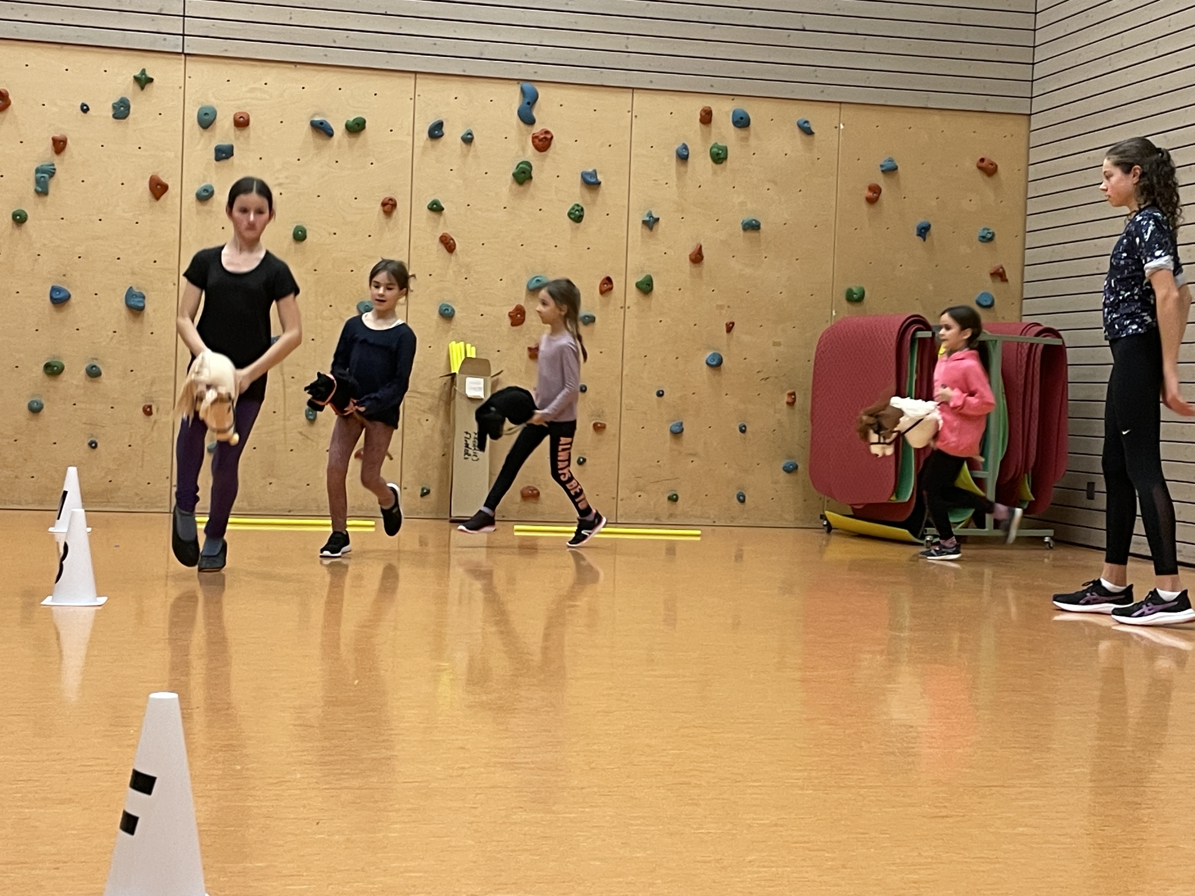 Nach Sitzkreis zum Austausch über die vergangene Woche ging es über Aufwärmen, Krafttraining und Dehnübungen in die Dressur- und Springaufgaben, die immer mit Musik unterstützt wurden. Abschließend gab es immer ein Spiel und einen Sitzkreis, um Rückmeldung zu geben und um Wünsche zu äußern.