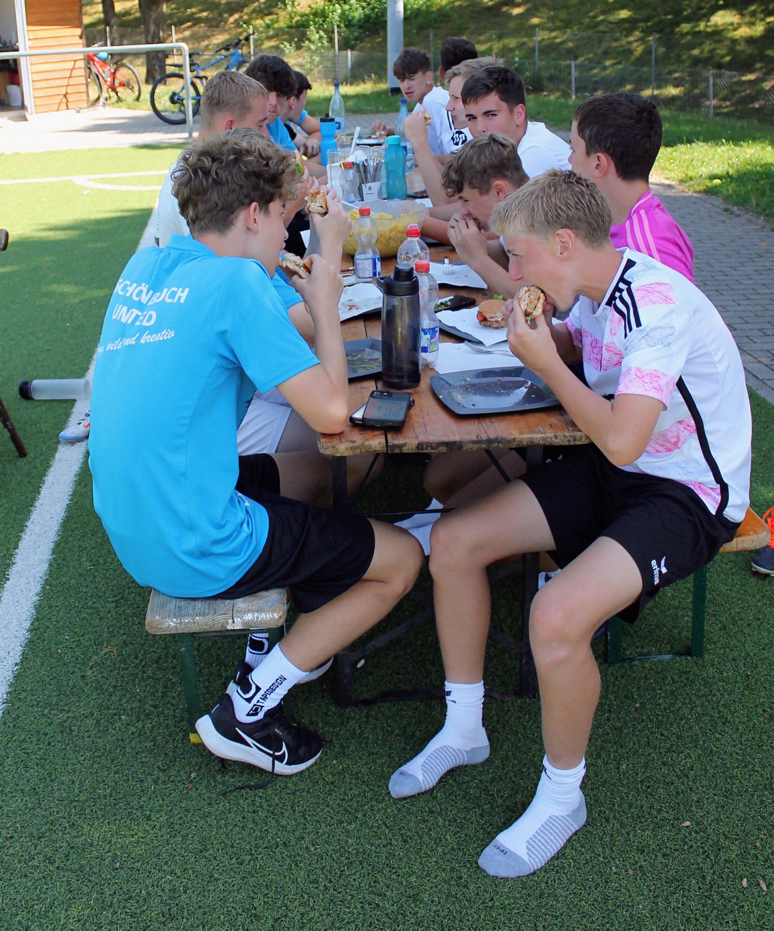 In der vorletzten Woche der Sommerferien organisierte unser Trainer Finn ein Fußballcamp für die C- und B-Jugend, an dem insgesamt 16 begeisterte Nachwuchskicker teilnahmen. Von Dienstag bis Freitag trainierten wir täglich von 10 bis mindestens 16 Uhr bei heißem Wetter. Ziel des Camps war es, vor Saisonstart nicht nur Spaß zu haben, sondern auch die Technik und athletischen Fähigkeiten zu verbessern. Ein gemeinsames Mittagessen stärkte den Teamgeist, besonders beliebt waren Smoothies und Bananenmilchshakes.